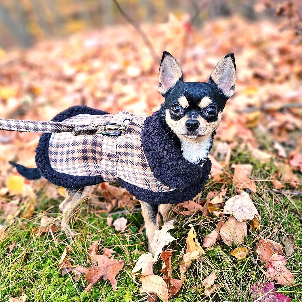 Our newest plaid designer coat in blue and green features a thick, warm and soft sherpa fleece collar and lining. This coat features touch fastener neck and chest closures. It includes a matching leash and a D-ring for easy leash attachment. Made with high-quality cotton/polyblend outer. We've continued the quality with double box stitch reinforced D-ring attachments. It also includes a matching plaid leash.