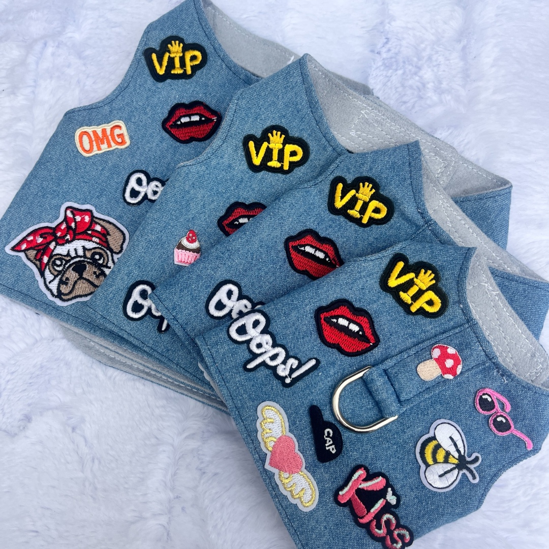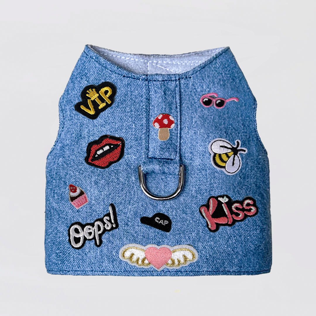 Introducing the stylish Rebel Dog Harness by Hello Doggie! Crafted from denim fabric and luxuriously lined with micro suede, this harness is designed to provide both comfort and durability for your furry companion. The inclusion of a secure d-ring allows for tether attachment, ensuring your baby's safety during walks or outings. Thanks to the convenient Velcro straps, this harness is not only secure but also easy to put on and take off. The decorative patchwork adds a touch of charm to the design. Treat your pup to the ultimate combination of fashion and practicality with the Rebel Dog Harness - a must-have accessory for every stylish pet parent and their rebel pup! Wash in cool on gentle cycle, no bleach or softener and air dry or tumble on low. LIMITED EDITION Sizes | XS - LG  MSRP | $64.00 *Harnesses are handmade, sizes may vary slightly. Made in USA.