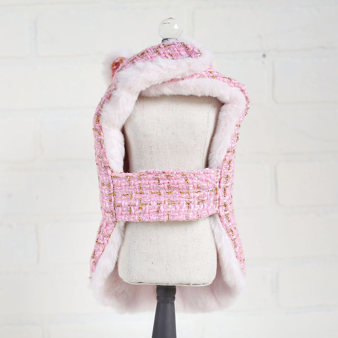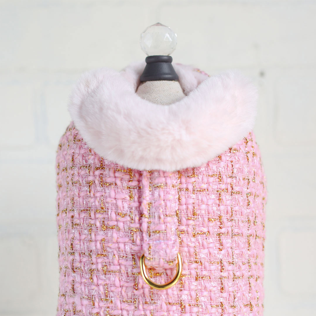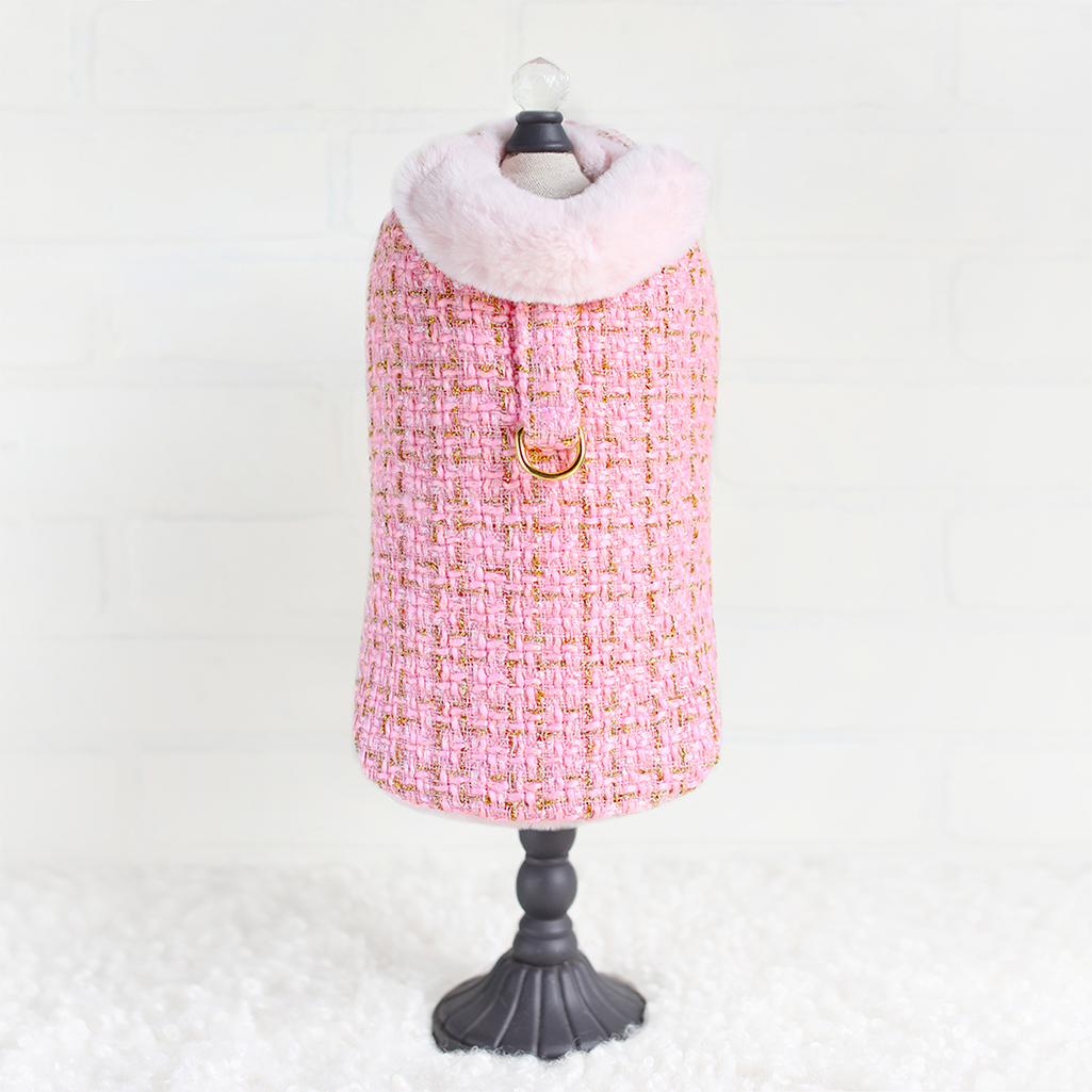 Your precious pooch will look regal in the Chantel Tweed Dog Coat by Hello Doggie. Our new coat collection was released just in time for the fall/winter season. When designing this coat we had the pooch in mind, our fur babies get cold too while they're out on the town for holiday shopping or a walk in the park. The coats are made from a beautiful soft tweed fabric and are lined with faux fur for a timeless design  and to keep out that extra chill. These coats are perfect to pair up with your favorite Hello Doggie sweater, featuring adjustable velcro straps for a perfect fit when adding layers. It is easy to care for, delicate wash with no softener or bleach and air dry. Our coats are fashionable and most importantly comfortable to wear. Each Coat has a matching harness, sold separately. Limited Edition MSRP $84.00 * Coats are handmade sizes may vary slightly. Made in USA.