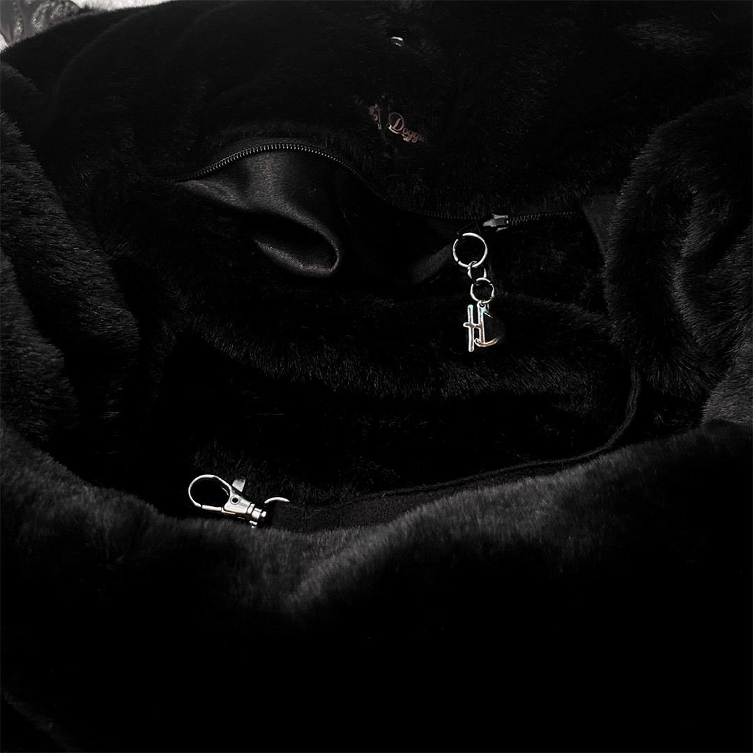 Elevate your outings with your furry friend to new heights of elegance with the Glamour Baby Dog Carrier. Beautifully adorned with hand-placed Swarovski crystals, this carrier sparkles with a touch of glamour that will turn heads wherever you go. Crafted from luxurious diamond quilted fabric and lined with luxurious Big Baby Fabric this carrier seamlessly blends comfort, style, and functionality. Designed with a chic signature satin pocket featuring a high-quality YKK zipper and a secure magnetic clasp closure, this carrier ensures your essentials are always within reach while providing peace of mind. Our built-in tether keeps your cherished pet secured as you navigate the world together. Spot Clean Only. Limited Edition  One Size -  15" L x 6" W x 10" H | For dogs up to 7lbs MSRP $297.00 *Carrier is handmade and sizes may vary slightly. Made in USA.