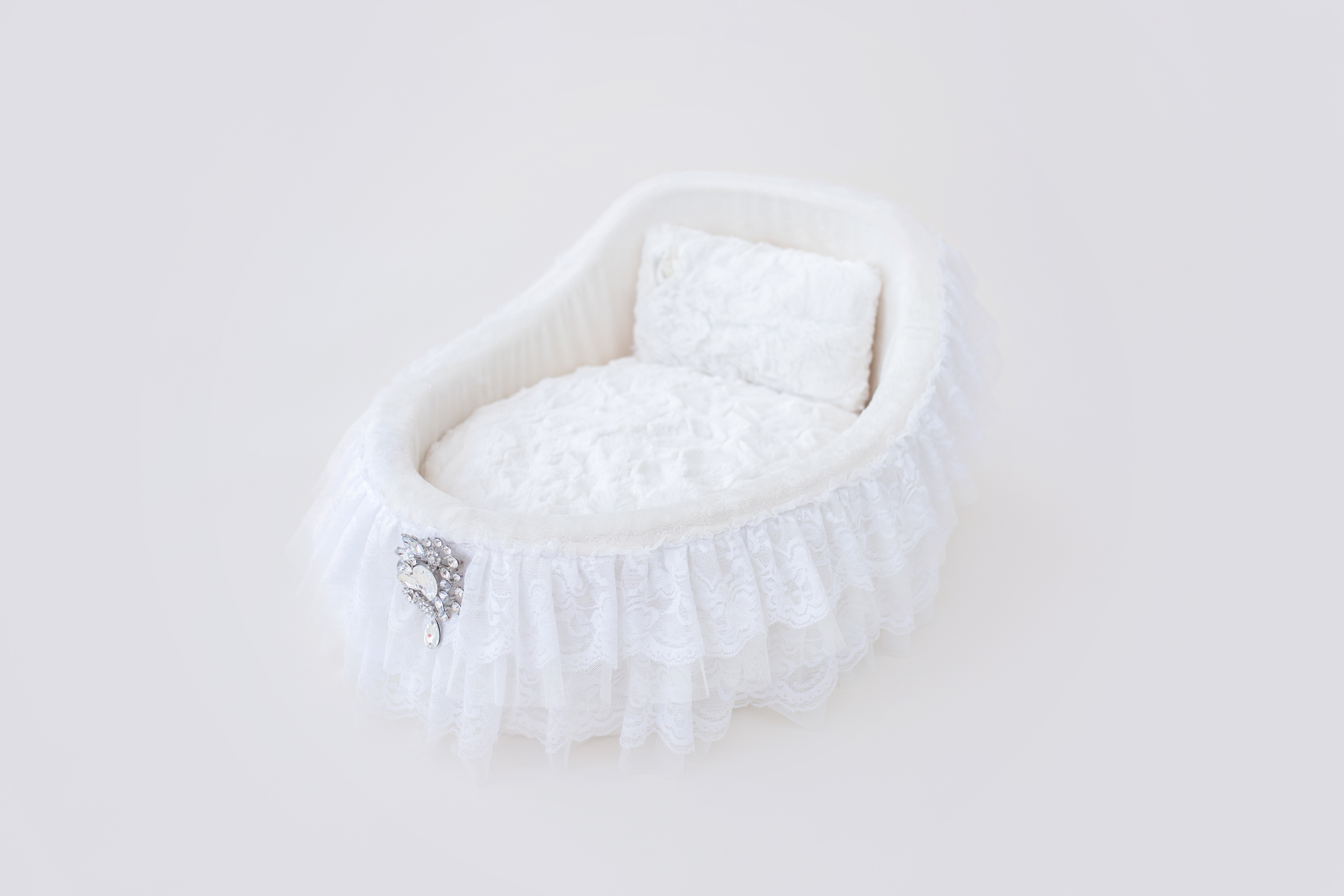 For that beautiful addition to your family, you'll want your pup to have sweet beginnings in our adorable Crib Bed by Hello Doggie, to lull your baby into sweet dreams. Trimmed in two-tiered romantic handmade lace, our cribs also feature a bouquet drop crystal brooch and removable pillow for easy care. Pair with any Hello Doggie Blanket. You'll be the envy of all your friends! Our collection offers four soft colors to choose from. One Size - *20" x 14" x 5 1/2"   |   Pillow inside - 18" x 12"   |   For dogs up to 6 Lbs MSRP - $177.99 *Bed is handmade and sizes may vary slightly. Made in USA.