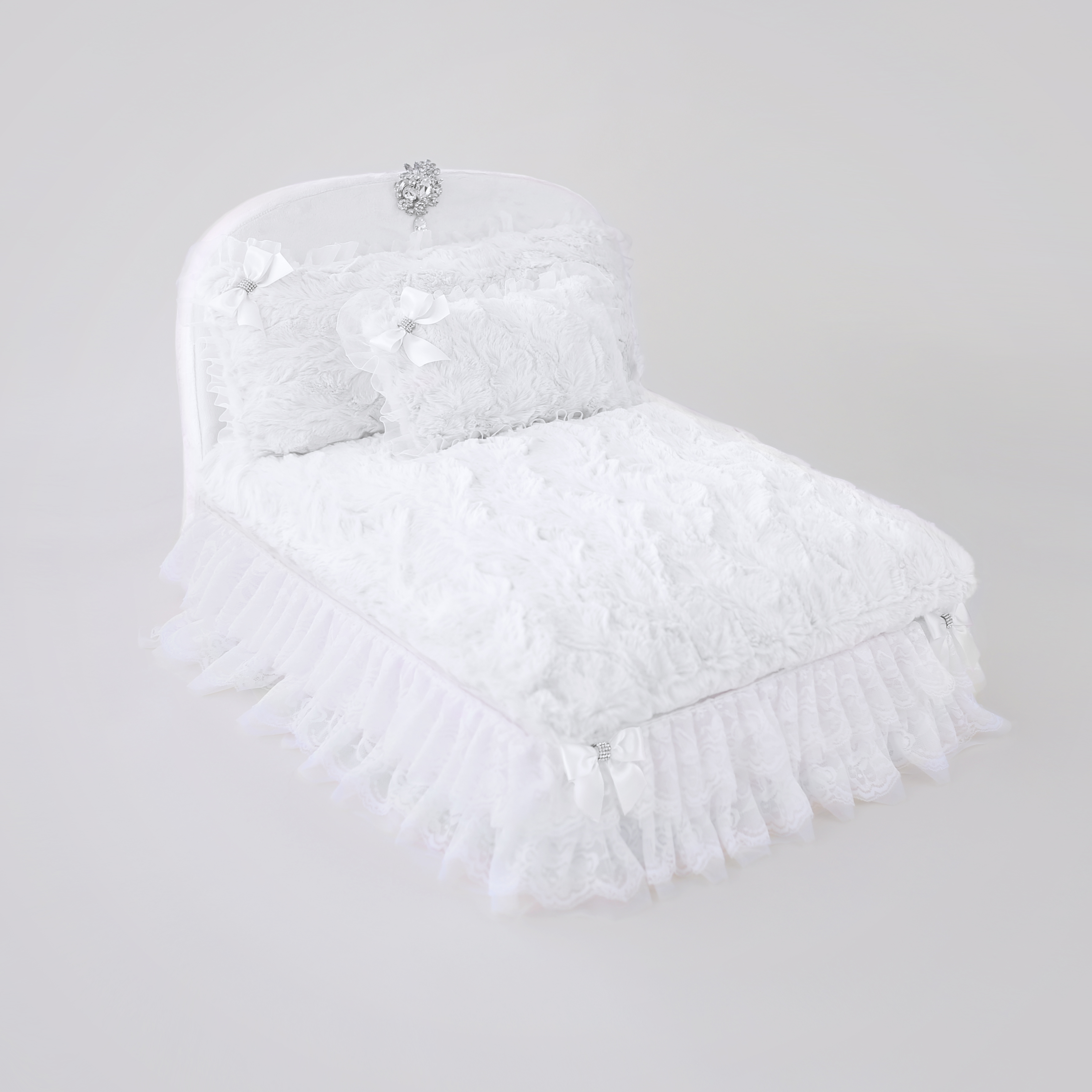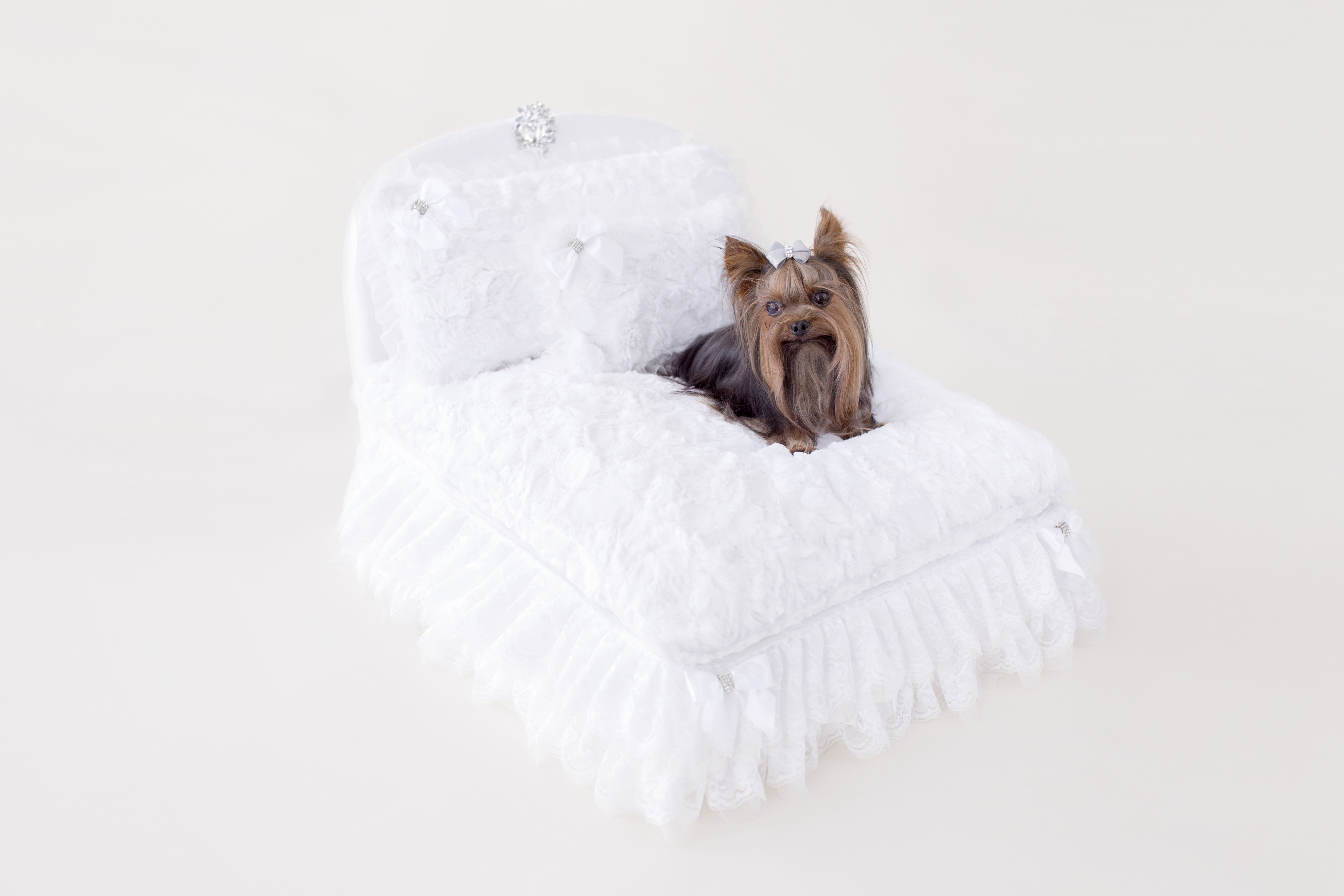 Global Pet Expo Best New Product 2019 Add a touch of elegance to your home with this exquisitely award winning designed dog bed only by Hello Doggie. This one of a kind glamorous style features adorned hand made romantic lace, crystal brooch, and satin bows. This bed also features  removable down pillow for extra comfort and easy care, along with zippered bottom to completely remove for delicate washing. This dog bed will make any pooch look and feel like a prince or princess. Guaranteed to take your breath away, your baby will have many enchanted nights filled with sweet dreams.  Available in 3 colors Baby Doll, Sterling and Snow White. You can customize the enchanted nights bed with your choice of bows, which comes in 13 colors. *Wash & dry in gentle low heat  One Size - 24" x 19" x 16" | For dogs up to 12lbs MSRP - $379.99 *Bed is handmade and sizes may vary slightly. Made in USA.