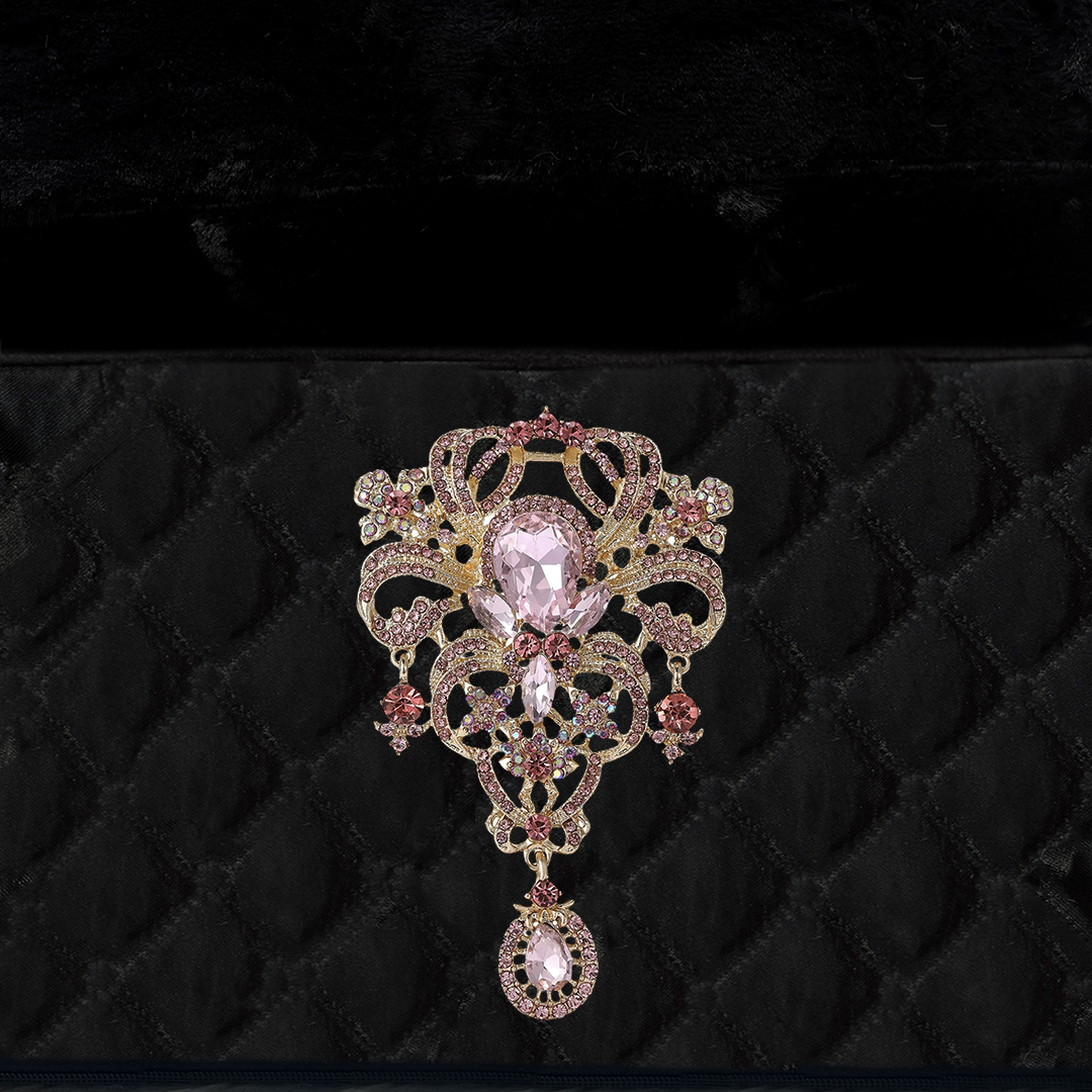 Introducing the Glamour Baby Bed by Hello Doggie, a breathtaking sanctuary for your beloved pet, where luxury meets unparalleled comfort. Inspired by the enchanting allure of the Enchanted Nights Beds, this exquisite bed transforms any space into a stylish haven for your glamorous pooch. Beautifully handcrafted from sumptuous diamond-tufted fabric, the Glamour Baby Bed envelops your pup in a world of sophistication, the plush Bella pillow, filled with plush down-like stuffing, provides a cloud-like resting experience that guarantees sweet dreams after a day filled with play. Adorned with our charming signature satin bow and radiant Swarovski Crystals, each carefully hand placed for a complete look. Designed for stability and peace of mind, the non-slip floor ensures your pet can lounge comfortably without a worry. Elevate your pet’s nap time and add a touch of glamour to your home with the Glamour Baby Bed by Hello Doggie—because your fur baby deserves nothing but the finest! The bed cover features a zipper to remove for easy care, wash mat pillow on delicate cycle in cold water, no bleach or softener and air dry or tumble on low. The cover and crystal pillow is spot clean only, remove brooch beforehand. Matches with Romantic & Bella Blankets, sold separately. Limited Edition One Size - 24" x 19" x 16" | For dogs up to 12lbs MSRP $429.99 *Bed is handmade and sizes may vary slightly. Made in USA.