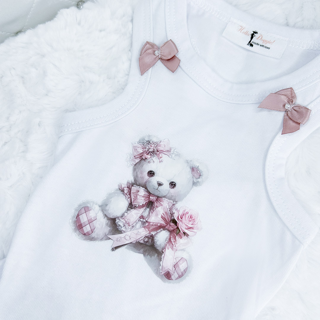 Introducing the Hugs x Kisses Dress by Hello Doggie, a delightful handcrafted dress that radiates charm for your beloved pet! Crafted from high-quality cotton, this dress ensures both comfort and style. Adorned with our signature dainty satin bows accented with small pearls, this dress adds a touch of sophistication and grace to your pet's wardrobe. The handmade delicate lace detailing and charming appliqué design elevate the overall look, creating a whimsical and endearing outfit. Whether for a special occasion or a casual day out, the Hugs x Kisses Dress by Hello Doggie is the perfect choice to make your furry friend feel pampered and cherished. Let your pet radiate love and sweetness in this enchanting dress! For easy care Spot Clean or wash in cool on delicate, no bleach or softener and air dry or tumble on low.      Sizes   XXS – LG  MSRP $36.00  *Dress is handmade and sizes may vary slightly. Made in USA.