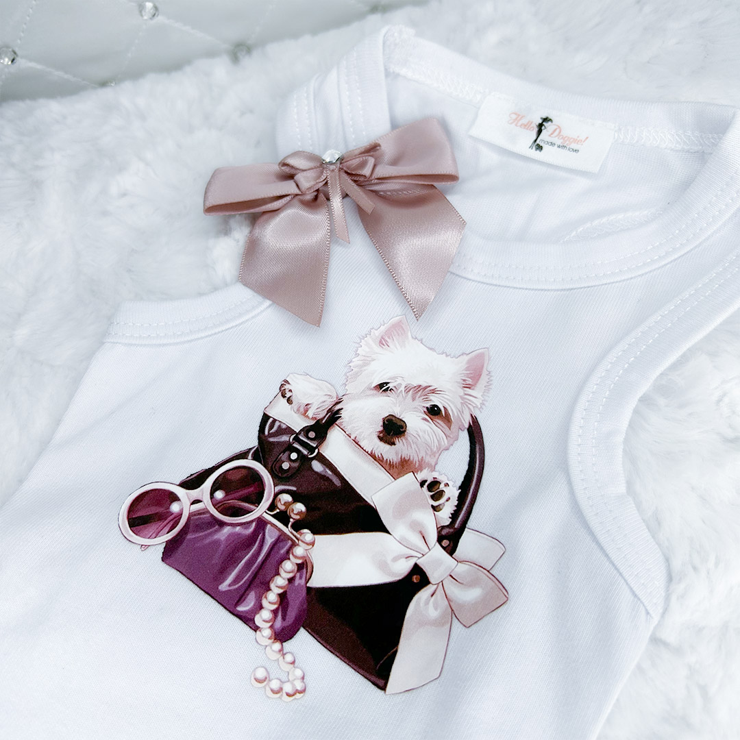 Introducing the Out n About Dog Dress by Hello Doggie, a must-have outfit for your precious pooch's everyday wear! Handmade with love from high-quality cotton and delicate lace trim, this dress is the epitome of charm and comfort. Adorned with a charming appliqué and our signature satin bows embellished with Swarovski crystals, this dress adds a touch of elegance and sparkle to any outing. Perfect for a casual day out on the town, your furry companion will turn heads and steal hearts in this enchanting ensemble. Let your pet strut their stuff in style and grace with the Out n About Dog Dress by Hello Doggie. For easy care Spot Clean or wash in cool on delicate, no bleach or softener and air dry or tumble on low.      Sizes   XXS – LG  MSRP $36.00 *Dress is handmade and sizes may vary slightly. Made in USA.